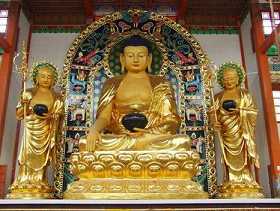佛有三身,分别是:毗卢遮那佛、卢舍那佛和释迦牟尼佛。毗卢遮那佛(即大日如来)是法身佛,为即是中道之理体也,佛以法为身,故称法身。其实十方三世一切佛,共同一法身,法身象征了世间宇宙的一切法皆有此出。卢舍那佛是报身佛,表示证得了绝对真理获得佛果而显示了佛的智慧的佛身。释迦牟尼佛是应身佛,是表示随缘教化,度脱世间众生而现的佛身。