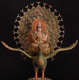 密教本尊之一。汉译有摩诃摩瑜利罗阇、佛母大孔雀明王等名,简称孔雀明王。一般明王多现忿怒像,令普通人有难以亲近之感。而此一明王则形象优雅、慈蔼可亲,而且以甚具诗意的孔雀为坐骑。