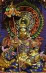 北方多闻尊天王有无尽的天龙八部、各路神祇等侍从。北方多闻尊天王普天身护法像,中国大乘佛教寺庙中一般总是身色如旃檀黄金,一面二臂。右手竖立把持各种珍宝镶嵌装饰之幢,左手捉持能变吐无尽宝藏之吐宝鼠。面色微怒。尊王的装扮十分华丽。