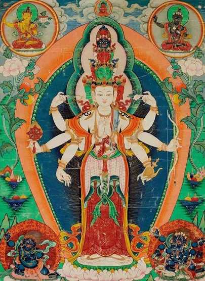 第三段「南无阿利耶,跋路吉谛摄婆罗耶,菩提萨埵耶,摩诃萨埵耶,摩诃伽楼腻迦耶」,就是十一面观音的全名;「南无阿利耶」即大持咒仙王,当时观世音菩萨应该就叫「阿利耶」;后面「跋路吉谛摄婆罗耶,菩提萨埵耶,摩诃萨埵耶,摩诃伽楼腻迦耶」,全是对十一面双手观音的尊称。印度名称不知该怎么称呼,咒语一般都不翻译,这里只大概作解释。